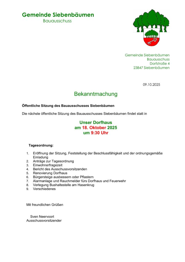 Sitzung Bauausschuss am 18.10.2025 um 09:30 Uhr Veröffentlicht am 9. Oktober 20259. Oktober 2025 von Mike Kloke